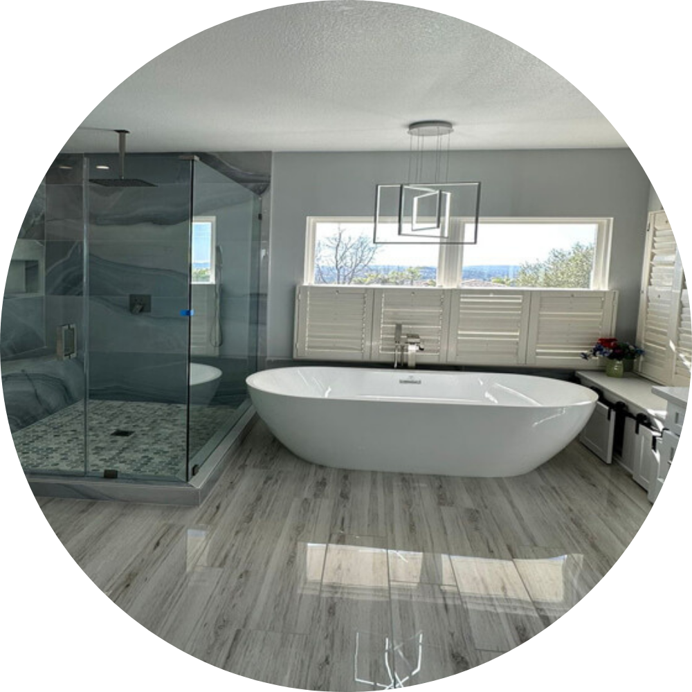 Bathroom and kitchen renovations, interior wall relocation, flooring replacement, tile work, and wall panel installation.